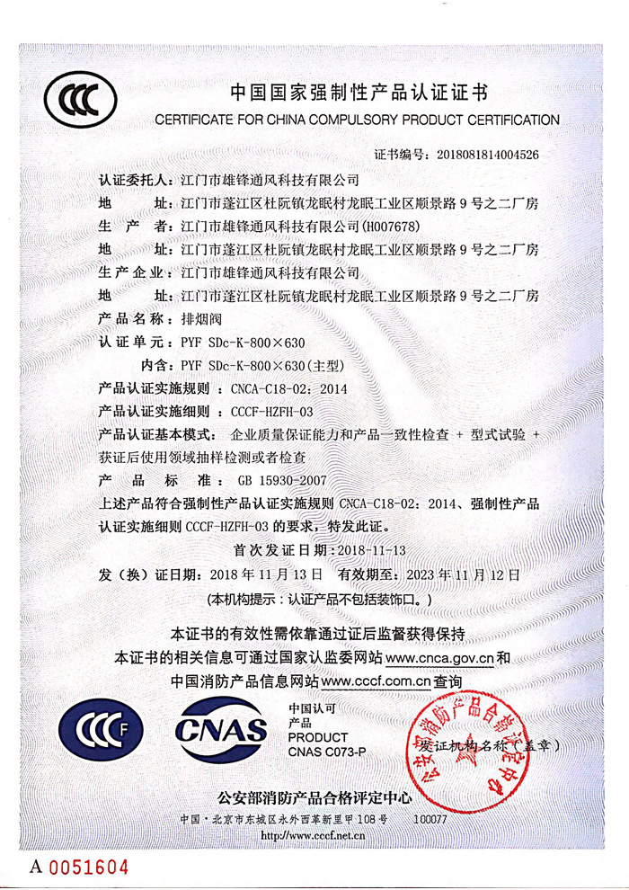 排煙產(chǎn)品認證證書