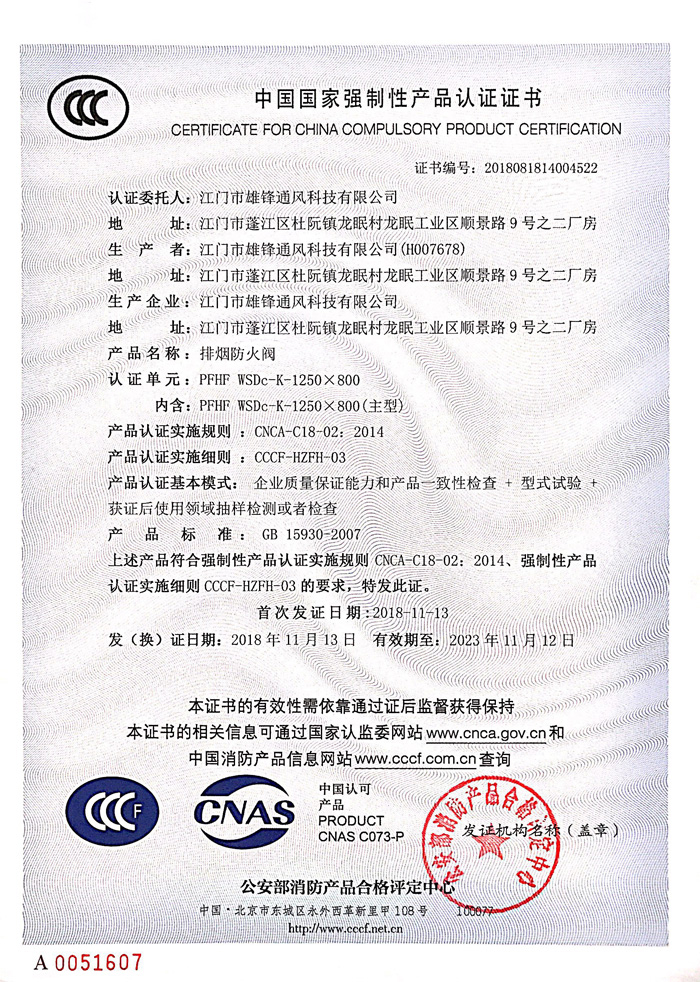 排煙防火閥產(chǎn)品認(rèn)證證書1